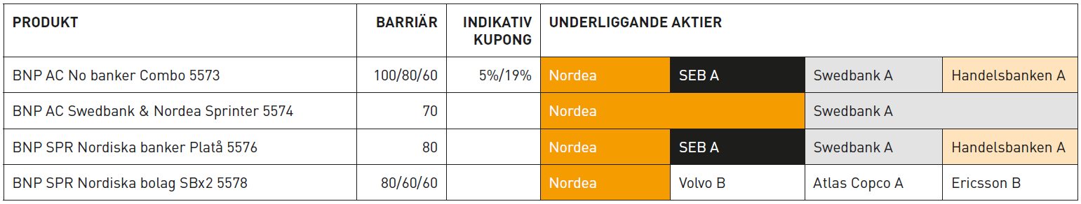 I aktuell emission erbjuds just nu en autocall och två sprinter som innehåller fyra aktier vardera samt en autocall med två underliggande aktier. För god riskspridning rekommenderar vi att du investerar i flera placeringar med olika aktier – se till att investeringarna innehåller många olika bolag så att portföljens sammanvägda exponering inte blir större än den risk portföljen kan bära. I tabellen nedan får du överblick över de ingående aktierna i placeringarna och var de överlappar varandra.