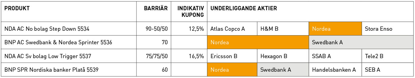I aktuell emission erbjuds just nu två autocall som innehåller fyra aktier vardera samt en sprinter och en autocall med två underliggande aktier. För god riskspridning rekommenderar vi att du investerar i flera placeringar med olika aktier – se till att investeringarna innehåller många olika bolag så att portföljens sammanvägda exponering inte blir större än den risk portföljen kan bära. I tabellen nedan får du överblick över de ingående aktierna i placeringarna och var de överlappar varandra.
