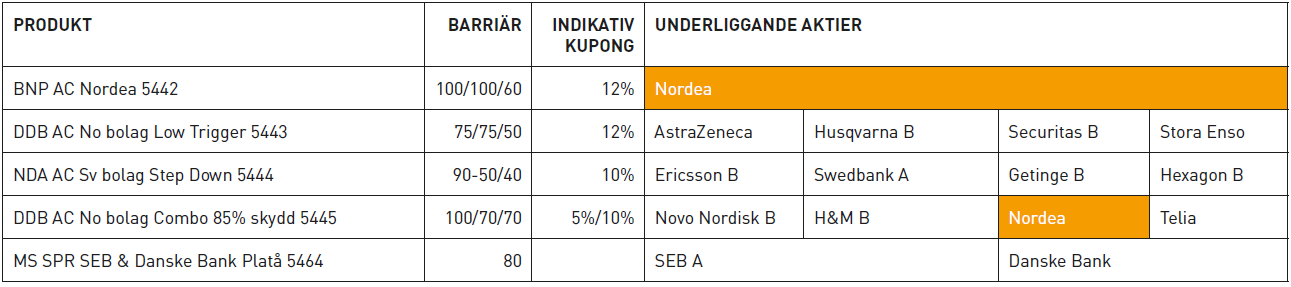 I aktuell emission erbjuds just nu tre autocall som innehåller fyra aktier vardera, en autocall med en underliggande aktie samt en sprinter med två underliggande aktier. För god riskspridning rekommenderar vi att du investerar i flera placeringar med olika aktier – se till att investeringarna innehåller många olika bolag så att portföljens sammanvägda exponering inte blir större än den risk portföljen kan bära. I tabellen nedan får du överblick över de ingående aktierna i placeringarna och var de överlappar varandra.